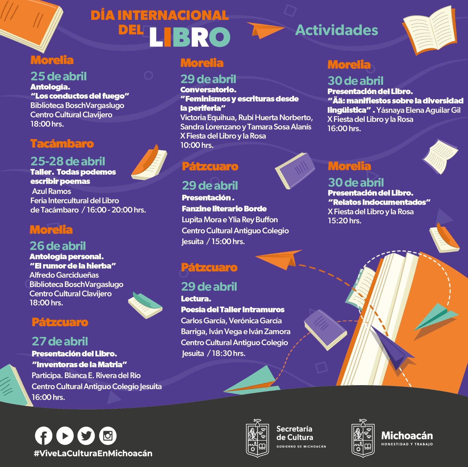 Morelia, Michoacán.- En el marco del Día Internacional del Libro, La Secretaría de Cultura de Michoacán (Secum) presentó la cartelera de actividades que se realizarán del 25 al 30 de abril del presente año, en Morelia, Tacámbaro y Pátzcuaro.