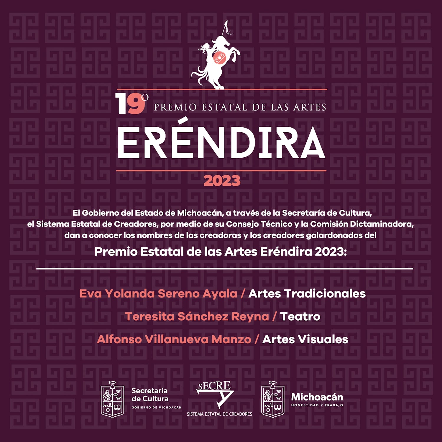 Morelia, Michoacán.- La Secretaría de Cultura de Michoacán (Secum) anuncia a las galardonadas y al galardonado del Premio Estatal de las Artes Eréndira 2023. Se trata de Eva Yolanda Sereno Ayala, Teresita Sánchez Reyna y Alfonso Villanueva Manzo, en los ámbitos de las Artes Tradicionales, Teatro, y Artes Visuales, respectivamente, informó la titular Tamara Sosa Alanís.