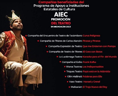 La Secretaría de Cultura de Michoacán (Secum) anunció a las 11 compañías beneficiadas del programa de Apoyo a Instituciones Estatales de Cultura (AIEC) 2023, del proyecto de Promoción del Teatro en Michoacán, mismas que recibirán estímulos económicos de más de 16 mil y 24 mil pesos.