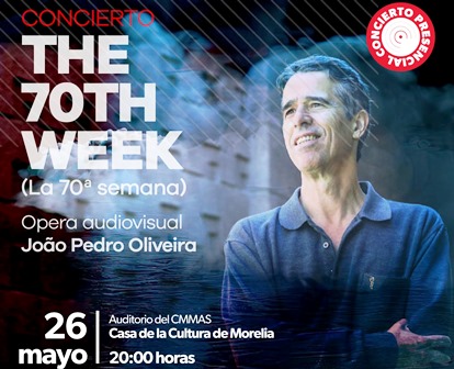 La ópera audiovisual de Joäo Pedro Oliveira, The 70th Week (La 70ª Semana), dará inicio a las 20:00 horas en el auditorio del Centro Mexicano para la Música y las Artes Sonoras CMMAS, ubicado dentro de la Casa de la Cultura de Morelia.