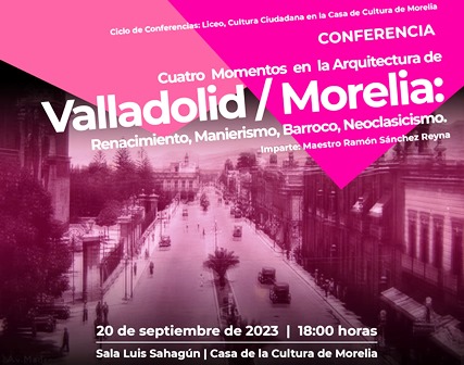 Impartida por el Dr. Ramón Sánchez Reyna, esta conferencia se realizará en la sala Luis Sahagún de la Casa de la Cultura de Morelia el día 20 de septiembre a las 18:00 horas. En conferencia, las personas asistentes aprenderán que la arquitectura patrimonial de la antigua Valladolid, hoy Morelia, no se remite a lo colonial, sino que pasa principalmente por el Renacimiento, el Manierismo, el Barroco y el Neoclásico.