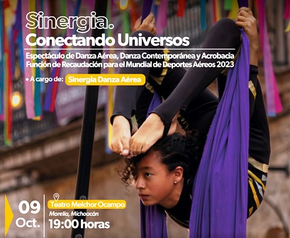La Secretaría de Cultura de Michoacán (Secum) invita a las y los michoacanos a asistir al espectáculo de danza aérea, contemporánea y acrobacia “Sinergia. Conectando Universos”, a cargo de la compañía Sinergia Danza Aérea que se presentará el lunes 9 de octubre a las 19:00 horas en el Teatro Melchor Ocampo.
