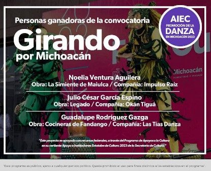 La Secretaría de Cultura de Michoacán (Secum) da a conocer a las personas ganadoras de la convocatoria de danza Girando por Michoacán, quienes serán acreedoras a un estímulo económico de 24 mil pesos, así lo informó la titular de la institución Tamara Sosa Alanís.