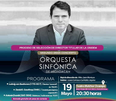 secum segundo 1505La Secretaría de Cultura de Michoacán (Secum) continúa con el proceso de selección para director titular de la Orquesta Sinfónica de Michoacán (Osidem), con el segundo gran concierto, bajo la batuta del director Juan Montoya, a realizarse el próximo viernes 19 de mayo, en el Teatro Melchor Ocampo.