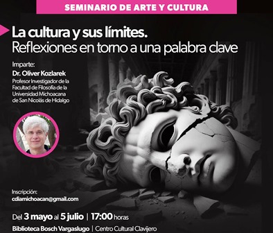 La cultura y sus límites. Reflexiones en torno a una palabra clave, es el nombre de esta actividad, que bajo la modalidad presencial contará con la guía de Oliver Kozlarek, profesor investigador de la Facultad de Filosofía de la Universidad Michoacana de San Nicolás de Hidalgo (UMSNH).