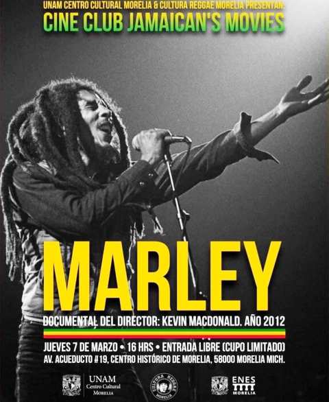 Para iniciar con este ciclo se proyectará el documental Marley (2012) del director Kevin Macdonald. En este documental se narra la vida del músico y leyenda Bob Marley, desde sus primeros días de vida hasta alcanzar la fama internacional. Conmemorando el “Bob Marley Day” el 6 de febrero, que marca el nacimiento la leyenda del reggae; y la fiebre que ocasionó el estreno de la película “Bob Marley: La Leyenda”, es pertinente dar inicio a este ciclo de proyecciones de la cultura jamaicana con la historia de su mayor exponente.