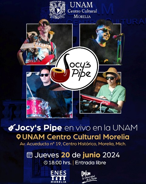 Como parte de las actividades culturales del UNAM Centro Cultural Morelia, de la Escuela Nacional de Estudios Superiores (ENES Morelia UNAM), llega por primera vez la banda de rock Jocy’s Pipe, la cual se presentará este jueves 20 de junio de 2024, a las 18 horas.