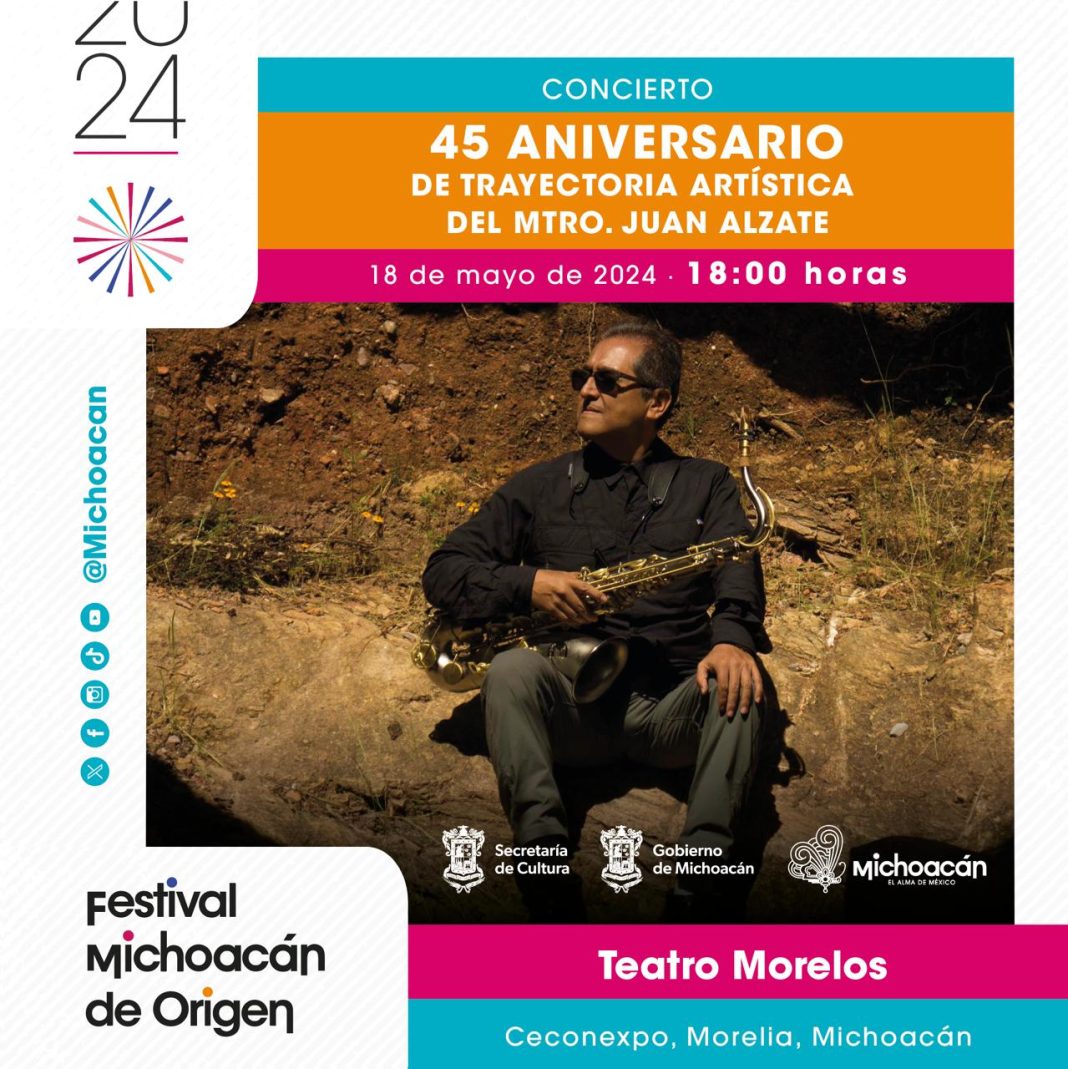 Morelia, Michoacán.- Con su inseparable saxofón, el músico y compositor Juan Alzate cumplirá 45 años de trayectoria artística, y qué mejor marco para hacerlo que el Festival Michoacán de Origen, en un evento que se llevará a cabo este sábado el 18 de mayo en el Teatro Morelos a las 18:00 horas, con su ensamble e invitados sorpresa.