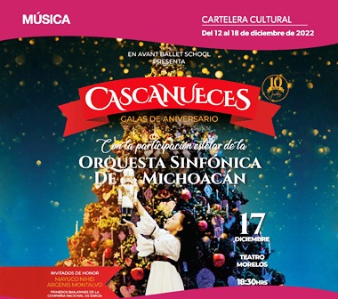 La Orquesta Sinfónica de Michoacán (OSIDEM) cerrará su segunda temporada de conciertos 2022 con la presentación de “El Cascanueces”, de Avant Ballet School, en el marco de su presentación de gala del décimo aniversario y en beneficio de la Cruz Roja Mexicana, delegación Morelia, el próximo 17 de diciembre, con funciones a las 11:30 y 18:30 en el Teatro Morelos.