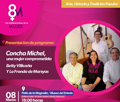 Por su labor como compositora y su lucha comprometida por los derechos de las mujeres, la figura de Concha Michel será reconocida por la Secretaría de Cultura de Michoacán (Secum), con un concierto a cargo de Betty Villicaña y la Fronda de Marsyas, el próximo 8 de marzo en el Museo del Estado (MEM).