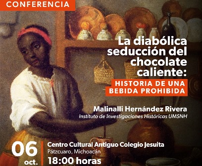 La Secretaría de Cultura de Michoacán (Secum) invita a la conferencia “La diabólica seducción del chocolate caliente: historia de una bebida prohibida”, impartida por la especialista Malinalli Hernández Rivera. Se llevará a cabo este viernes 6 de octubre a las 18:00 horas en el Centro Cultural Antiguo Colegio Jesuita, en Pátzcuaro.