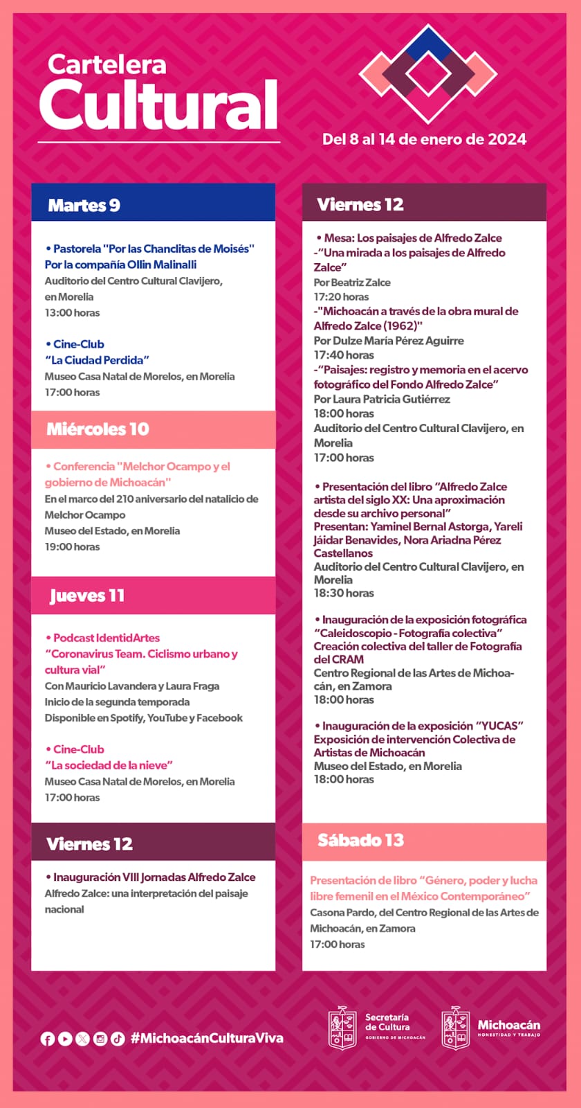Morelia, Michoacán.- En este regreso a clases, podrás disfrutar de grandes actividades artísticas y culturales en los museos y recintos de la Secretaría de Cultura de Michoacán (Secum). Conoce aquí la cartelera y arma tu plan para la semana del 8 al 14 de enero.