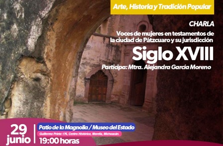 Con la charla “Voces de mujeres en testamentos de la ciudad de Pátzcuaro y su jurisdicción. Siglo XVIII” continúa el programa Arte, Historia y Tradición Popular en el Museo del Estado de Michoacán (MEM), el miércoles, 29 de junio, en el Patio de la Magnolia, a partir de las 19:00 horas, con acceso gratuito.