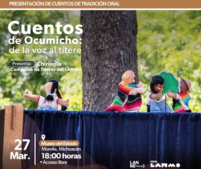 Niñas y niños podrán disfrutar la presentación de tres cuentos de Ocumicho, a cargo de la compañía de títeres Chirinola del Laboratorio Nacional de Materiales Orales (Lanmo), el miércoles 27 de marzo a las 19:00 horas, en el Museo del Estado, con entrada libre.