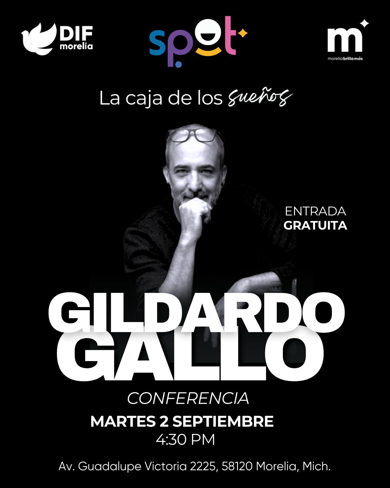 El DIF Morelia que encabeza la presidenta honoraria, Paola Delgadillo Hernández, invita a la conferencia gratuita del artista visual Gildardo Gallo, este martes 2 de septiembre a las 16:30 horas en el Centro Spot Morelia, como parte de las acciones que promueven el acceso a la cultura y el desarrollo integral de las juventudes.