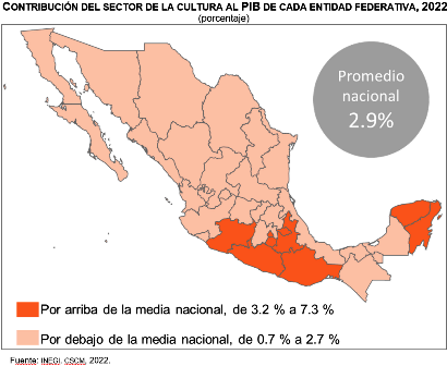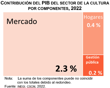 En 2022, el Producto Interno Bruto (PIB) del sector de la cultura reportó un monto de 815 mil 902 millones de pesos. Esto significó una contribución de 2.9 % al PIB nacional, que se integra por las actividades de mercado -que realizan los agentes privados y que generan bienes y servicios culturales con fines de lucro-, las relacionadas con los hogares -trabajo voluntario en la organización de actividades culturales o comercio de productos culturales en la vía pública, entre otras- y las de gestión pública – que realizan unidades de gobierno y que contribuyen a facilitar el acceso, la difusión, desarrollo y fortalecimiento de actividades culturales-.