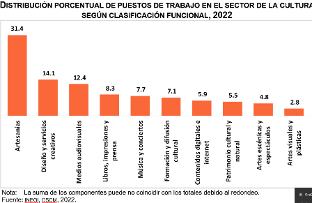 Al distinguir por la clasificación funcional, las áreas que generan mayor aportación a los puestos de trabajo del sector cultural son las artesanías que generaron 31.4 %; el diseño y los servicios creativos aportaron 14.1 %; los medios audiovisuales, 12.4 % y los libros, impresiones y prensa, 8.3 % del sector.
