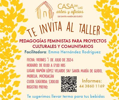 “Pedagogías feministas para proyectos culturales y comunitarios” se impartirá el próximo viernes 5 de julio, de 10 de la mañana a 17 de la tarde en las instalaciones de “La Casita”, ubicadas en Casa Ejidal de Santa María de Guido, Ramón López Velarde s/n, a espaldas de las oficinas de la Tenencia en Morelia, Michoacán.