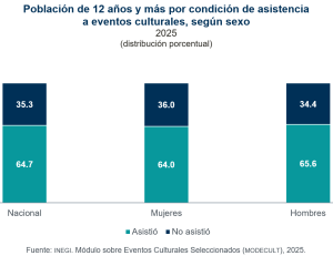 En 2025, la brecha de género en la asistencia a eventos en áreas urbanas fue de 1.7 puntos porcentuales; 60.4 % de mujeres y 62.1 % de hombres