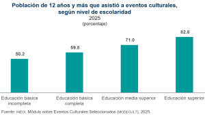 La asistencia a eventos culturales se diferencia, según el nivel de escolaridad. En los últimos 12 meses, 50.2 % de la población con educación básica incompleta -refiere a personas sin escolaridad, con algún grado de preescolar, primaria o hasta dos años aprobados de secundaria. La educación básica completa corresponde a la población de 12 años y más con tres años aprobados en educación secundaria-,  asistió a algún evento cultural, en contraste con 82.8 % de la población con algún grado aprobado en educación superior.