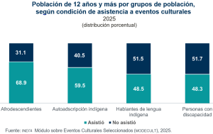 Por grupos de población, las personas con discapacidad y los hablantes de lengua indígena presentaron los porcentajes más bajos de asistencia a eventos culturales, con 48.3 y 48.5, respectivamente.