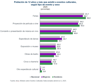 Respecto a la población de 12 años y más que asistió a algún evento cultural, 61.7 % declaró su participación en ferias (muestras artesanales, gastronómicas o de productos locales) y 54.2 %, en proyección de película o cine. Los eventos con porcentajes menores fueron 16.7 para circo o charrería y 21.0 en obras de teatro. Al distribuir según sexo, la mayor diferencia se obtuvo en espectáculo de danza, con un porcentaje de asistencia mayor de mujeres que de hombres (30.7 y 24.7, respectivamente).