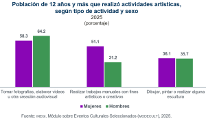 Las actividades artísticas con mayor porcentaje de participación de la población de 12 años y más en el país fueron tomar fotografías, elaborar videos u otra creación audiovisual, con 61.0 por ciento. Siguió realizar trabajos manuales con fines artísticos o creativos, con 42.1 % y dibujar, pintar o realizar alguna escultura, con 35.9 por ciento.