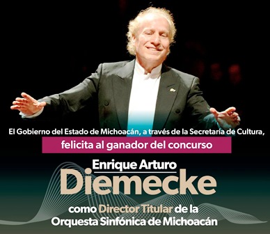 La Secretaría de Cultura de Michoacán (Secum) anunció al maestro Enrique Arturo Diemecke como el nuevo director titular de la Orquesta Sinfónica de Michoacán (Osidem), resultado del concurso que se realizó durante mayo y junio en el Teatro Melchor Ocampo.