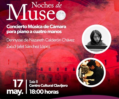 La Secretaría de Cultura de Michoacán (Secum) invita al programa de música de cámara para piano a cuatro manos, como parte del programa Noches de Museo, a llevarse a cabo el miércoles 17 de mayo a las 18:00 horas en la sala 8 del Centro Cultural Clavijero.