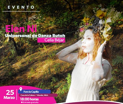 La Secretaría de Cultura de Michoacán (Secum) invita a disfrutar el unipersonal de danza butoh Eien Ni, a cargo de la artista Celia Béjar, el próximo sábado 25 de marzo en la Casa de la Cultura de Morelia.