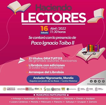 La Secretaría de Cultura de Michoacán (Secum), en coordinación con el Fondo de Cultura Económica (FCE) y el Consejo Editoral de la Cámara de Diputados, llevarán el programa «Haciendo Lectores», gira del Librobús, por 14 municipios de la entidad del 16 de abril al 6 de mayo.