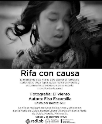 Este sábado 2 de diciembre en punto de las 11 horas dentro de la Casa de las Artes y Oficios de Santa María de Guido, proyecto gestionado por RedLab Laboratorio de Gestión y Vinculación Cultural, ubicada en Ramón López Velarde s/n, Santa María de Guido, en Morelia, Michoacán, se llevará a cabo una rifa en beneficio del fotógrafo Carlos Vega Tapia.