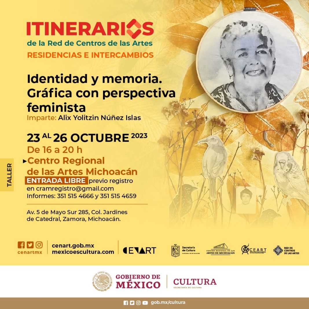 Morelia, Michoacán.- Con el apoyo de la Secretaría de Cultura de Michoacán (Secum), el Centro Regional de las Artes (CRAM) y el Centro de las Artes de Querétaro (CEART), ofrecerán en Zamora el taller “Identidad y Memoria. Gráfica con perspectiva Feminista”, del 23 al 26 de octubre, de 16:00 a 20:00 horas.