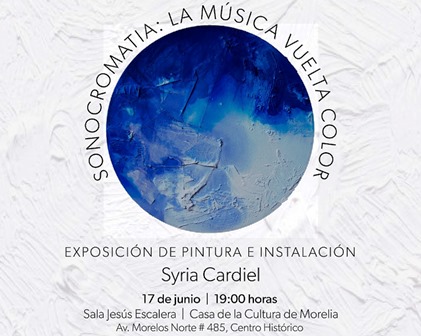 Los sonidos se materializan en colores y texturas que toda la piel puede experimentar en “Sonocromatia: la música vuelta color”; exposición que la artista parachense Syria Cardiel presentará con el apoyo de la Secretaría de Cultura de Michoacán (SECUM), en la sala Jesús Escalera de la Casa de la Cultura de Morelia, el próximo 17 de junio a las 19:00 horas.