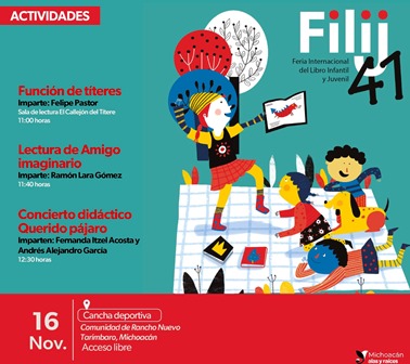 Las actividades de “La FILIJ en todas partes” se realizarán del 10 al 19 de noviembre en los municipios de Lázaro Cárdenas, Puruándiro, Tzitzio, Tacámbaro, Tarímbaro y Morelia. Todas las actividades serán con acceso gratuito y aptas para todo público.