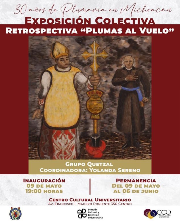 La exposición colectiva retrospectiva “Plumas al vuelo”, permanecerá abierta al público del 09 de mayo al 06 de junio, en el Centro Cultural Universitario, en Morelia, Michoacán.