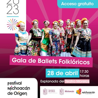 La Gala de Ballets Folklóricos inaugurará este viernes 28 de abril el foro cultural del Festival Michoacán de Origen, en la explanada del Teatro Morelos, a las 17:30 horas. Las y los asistentes serán deleitados por las agrupaciones dancísticas Ensamble Folklórico Tata K´eri, el Ballet Folklórico de Morelia, el Grupo Folklórico Raíces, y el Ballet Folklórico Búho Nicolaita.