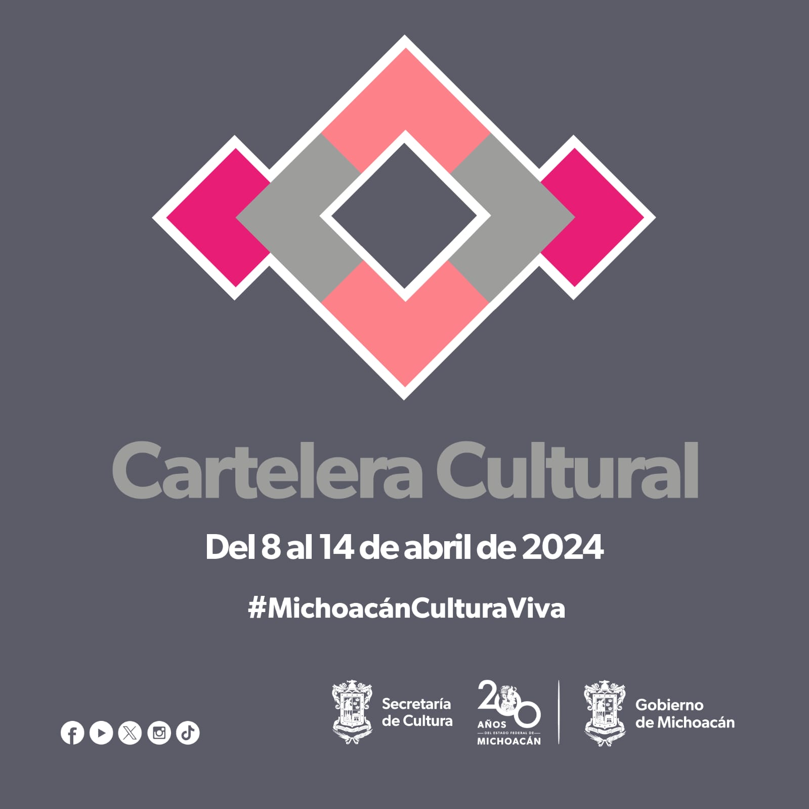 Morelia, Michoacán.- Te dejamos algunas recomendaciones para que armes tu recorrido cultural del 8 al 14 de abril, por diferentes espacios de la Secretaría de Cultura de Michoacán (Secum), a fin de que disfrutes de muchas actividades artísticas.
