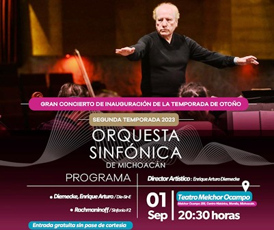 El viernes 1 de septiembre dará inicio la segunda temporada 2023 de la Orquesta Sinfónica de Michoacán (Osidem), con la estelar dirección del maestro Enrique Arturo Diemecke, así lo dio a conocer la secretaria de Cultura de Michoacán, Tamara Sosa Alanís.