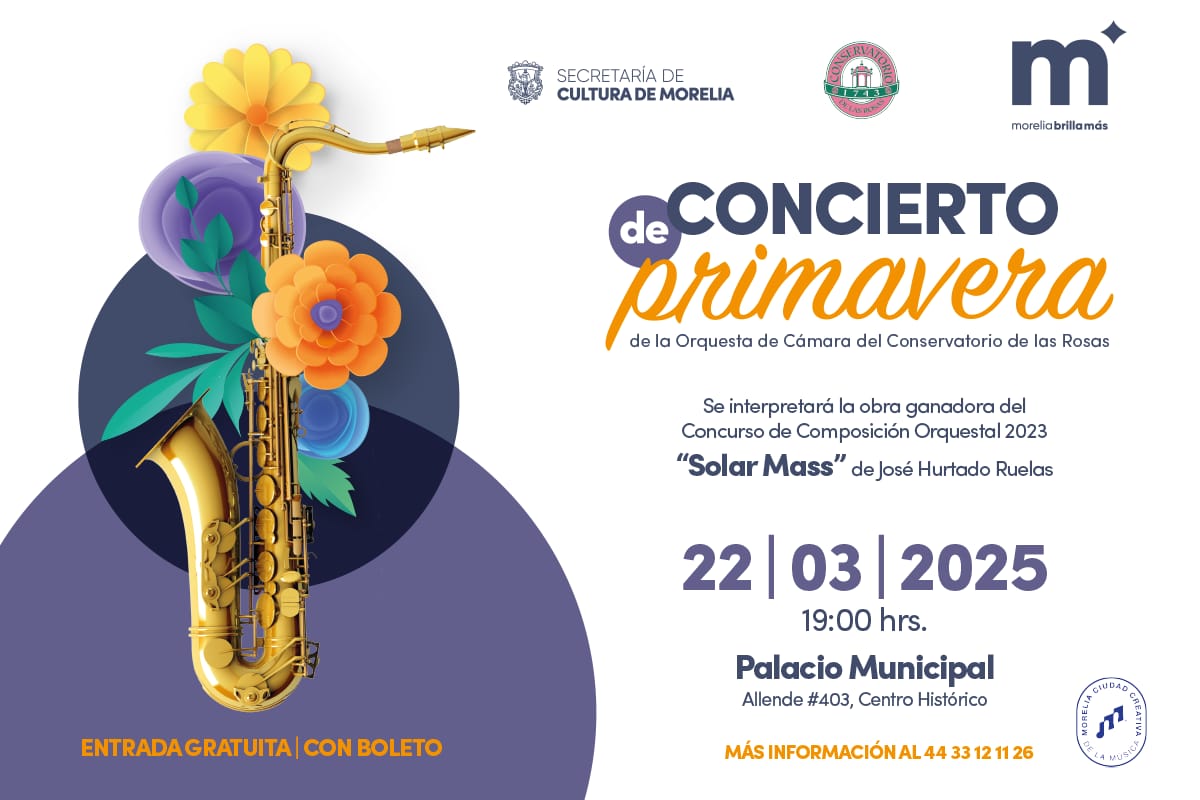 El ayuntamiento de Morelia que preside el alcalde, Alfonso Martínez Alcázar, invita al Concierto de Primavera, donde se interpretará la pieza ganadora del Concurso de Composición Orquestal 2023, “Solar Mass” de José Luis Hurtado Ruelas, a cargo de la Orquesta de Cámara del Conservatorio de las Rosas. Este evento forma parte de las actividades para promover el arte y construir la paz en el municipio.