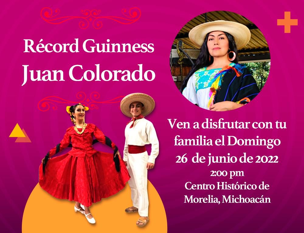 Con la finalidad de lograr el Récord Guinness al son de “Juan Colorado”, la Secretaría de Cultura de Morelia invita a todas y todos los ciudadanos a participar en este evento que se llevará a cabo el próximo domingo 26 de junio en el Centro Histórico de la ciudad, a las 2:00 de la tarde.
