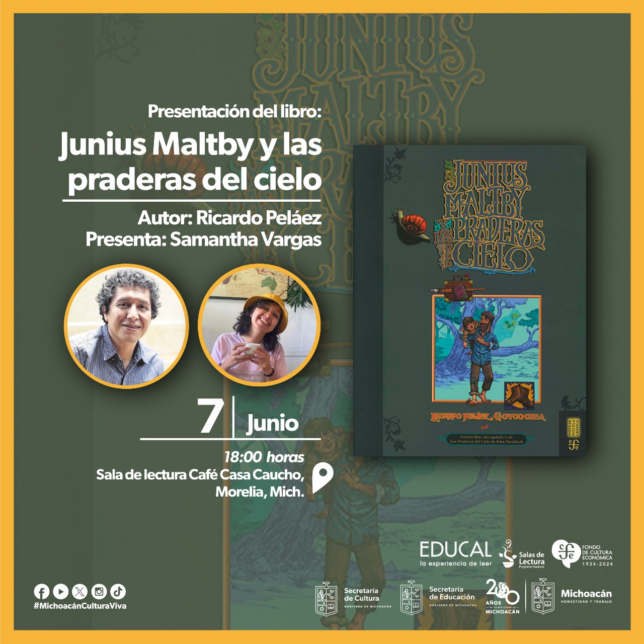Morelia, Michoacán.- En el marco de la ruta de fomento a la lectura que coordinan el Fondo de Cultura Económica y el Gobierno del Estado, a través de las secretarías de Cultura y de Educación, se presentará el libro Junius Maltby y las praderas del cielo, de Ricardo Peláez, en la sala de lectura Café Casa Caucho, mañana viernes 7 de junio a las 18:00 horas.