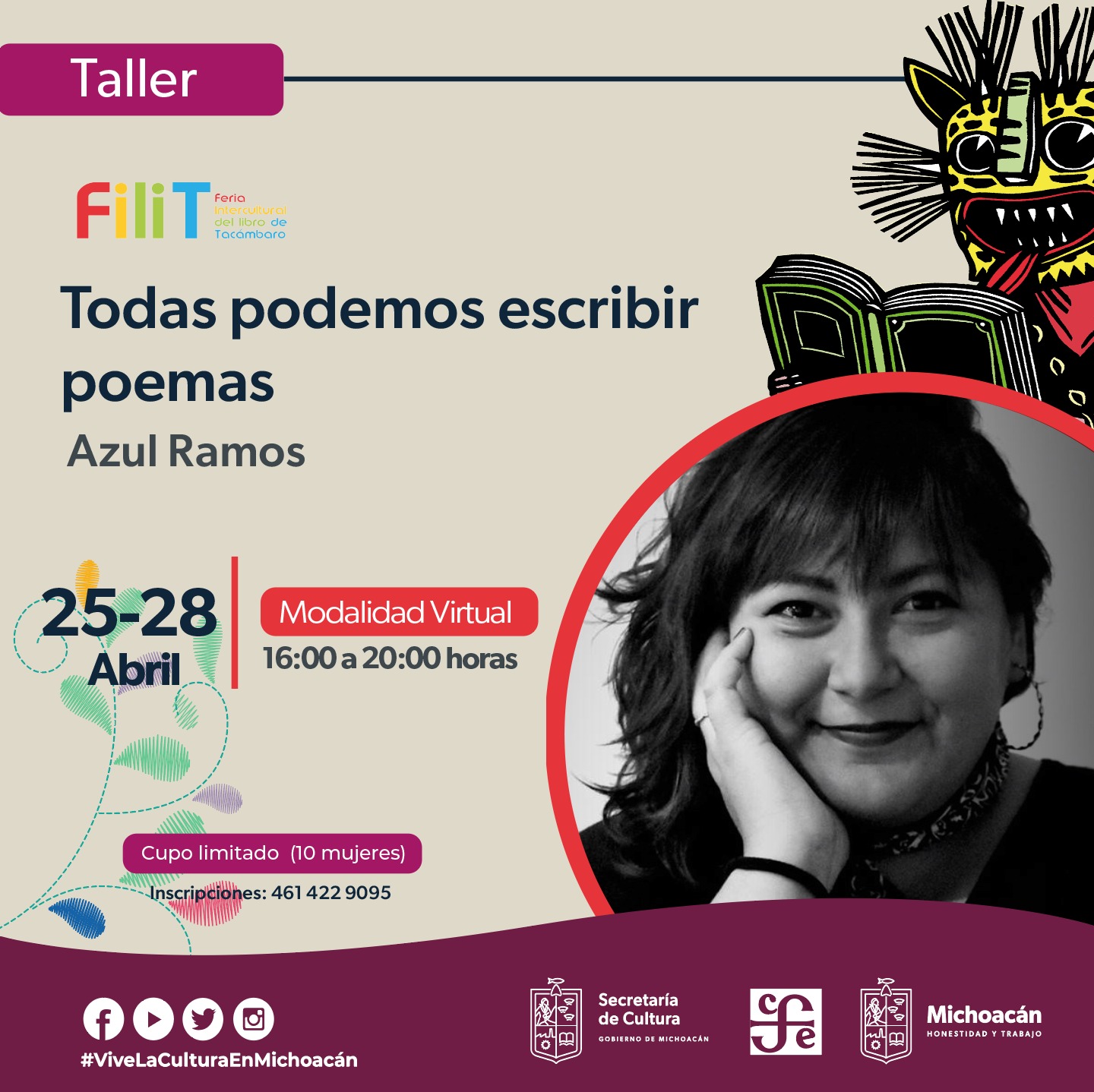 Morelia, Michoacán.- En el marco de la colaboración con la séptima edición de la Feria Intercultural del Libro de Tacámbaro (FILIT) 2023, que tendrá lugar del 21 al 28 de abril, la Secretaría de Cultura de Michoacán invita al taller Todas podemos escribir poemas, que será impartido de forma virtual por la poeta Azul Ramos, del 25 al 28 de abril del año en curso.