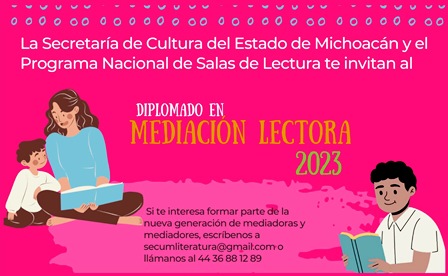 La Secretaría de Cultura de Michoacán (Secum) invita al Diplomado en Mediación Lectora, como parte del Programa Nacional de Salas de Lectura, que se realizará en línea todos los viernes, desde el mes de marzo a noviembre del año en curso, a las 18:00 horas.