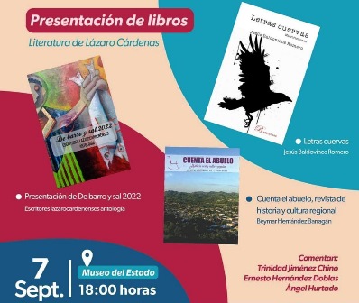 La Secretaría de Cultura de Michoacán (Secum) invita a la presentación de tres obras literarias de autores originarios de Lázaro Cárdenas, el próximo jueves 7 de septiembre a las 18:00 horas en el Museo del Estado.