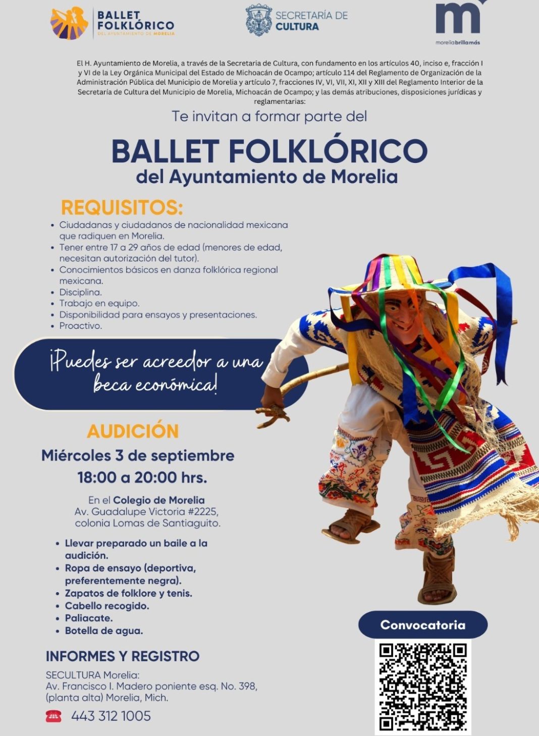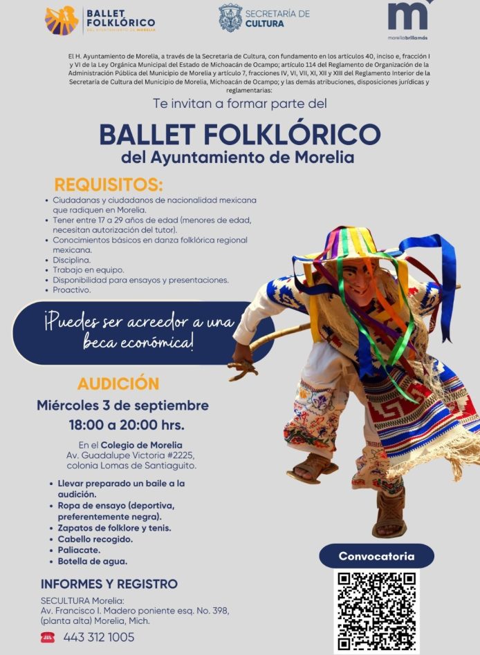 El Gobierno de Morelia que encabeza el presidente municipal, Alfonso Martínez Alcázar, por medio de su Secretaría de Cultura (SeCultura) invita a personas de entre 17 y 29 años a sumarse al Ballet Folklórico del Ayuntamiento, con el objetivo de la administración por promover y fomentar la cultura, las tradiciones mexicanas y la danza.