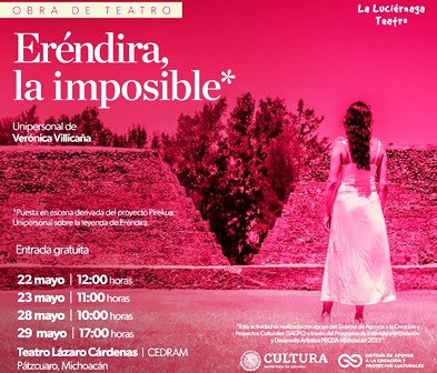 Pátzcuaro, Mich.- La Secretaría de Cultura de Michoacán (Secum) te invita al Centro Dramático de Michoacán (Cedram), en Pátzcuaro, para que disfrutes durante mayo alguna de las cuatro funciones de Eréndira, la imposible; el unipersonal de Verónica Villicaña, beneficiada del Programa de Estímulos a la Creación y Proyectos Culturales Michoacán 2023, en la categoría de creadores con trayectoria.