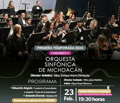 La orquesta ha preparado un extraordinario programa con la participación del solista Miguel Ángel Villanueva, con un repertorio compuesto por el Concierto número dos para flauta y orquesta Voces de la naturaleza, escrito por Eduardo Angulo y la sinfonía número ocho, de Antonín Dvorak.