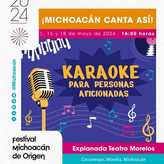 Este miércoles, ven y canta tu canción favorita en el karaoke Festival Michoacán de Origen. La cita es a las 16:00 horas en el Foro Cultural de la explanada del Teatro Morelos.