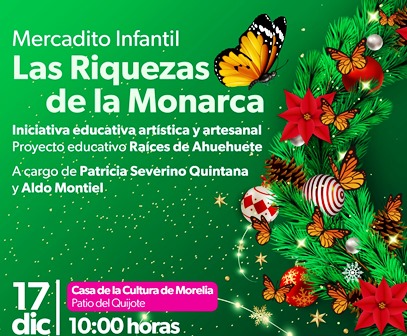La Secretaría de Cultura de Michoacán (Secum) a través de la Casa de la Cultura de Morelia en coordinación con el proyecto educativo Raíces de Ahuehuete, realizarán el mercadito infantil “Las Riquezas de la Monarca” el sábado 17 de diciembre en el Patio del Quijote del recinto cultural a partir de las 10:00 horas con acceso gratuito.